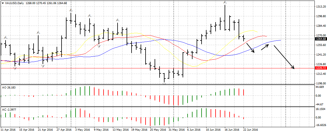 Покупателям золота следует смириться с мыслью, что уровень 1300 им пока неподвластен. А формирование разворотного бара на продажу от 1270 на дневном таймфрейме ставит под сомнение продолжение среднесрочного восходящего движения.