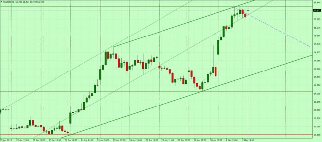 Хотя рост пары USD/RUB продолжается, восходящий канал изменил конфигурацию. Сейчас цена находится около верхней границы канала, откуда может скорректироваться в район 64.90.