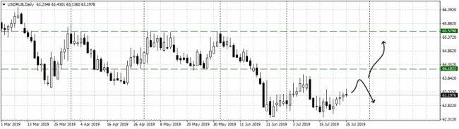 Пара доллар/рубль дважды в июле пыталась прорвать поддержку у 62.40. Очередной отбой пару дней назад вдохновил покупателей на укрепление выше 63 фигуры, и на данный момент пара торгуется чуть выше данной отметки. Если восходящее движение продолжится, стоит ожидать подхода к 63.80-63.60. Данный диапазон сдерживал падение пары практически весь текущий год, поэтому здесь быкам по гринбек придется столкнуться с серьезным препятствием. Укрепление рубля в последние недели было связано с периодом уплаты налогов в РФ. Сегодня самый активный день по сбору акциз, НДС и НДПИ.